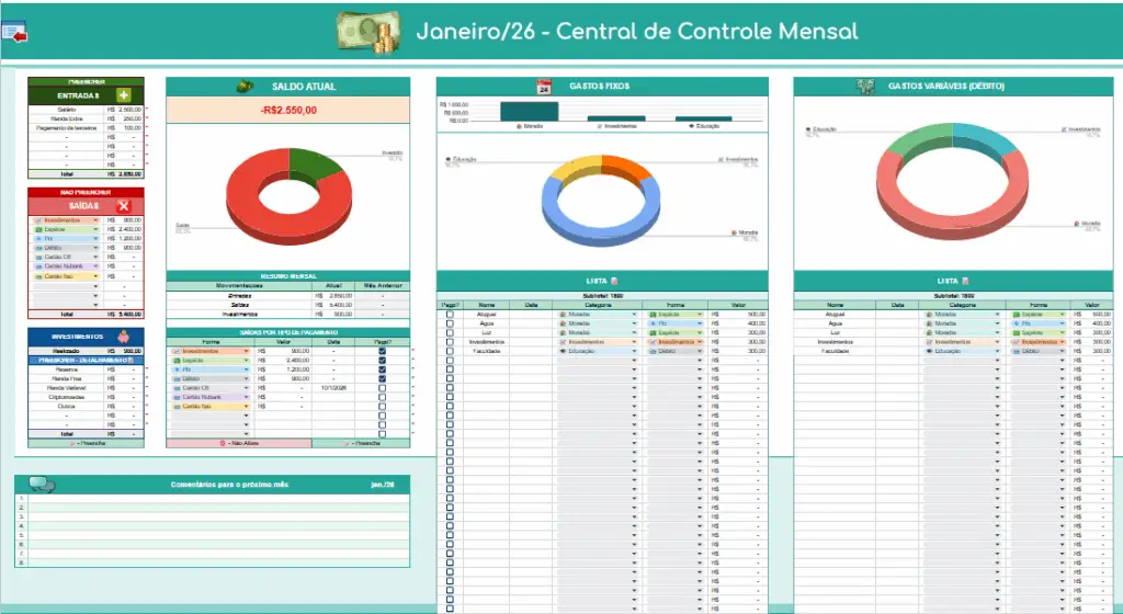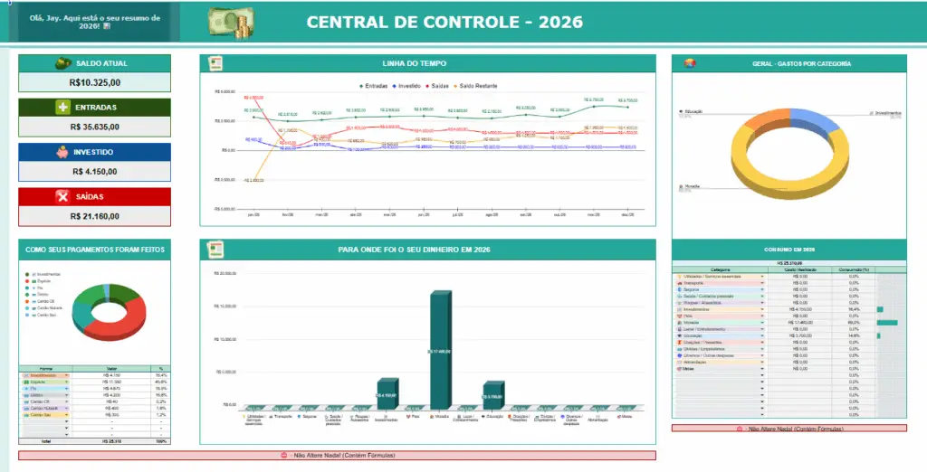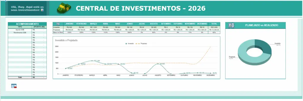 A planilha consolida automaticamente os 12 meses de 2026, mostrando tudo o que entrou, saiu, foi investido e o destino exato do seu dinheiro ao longo do ano.