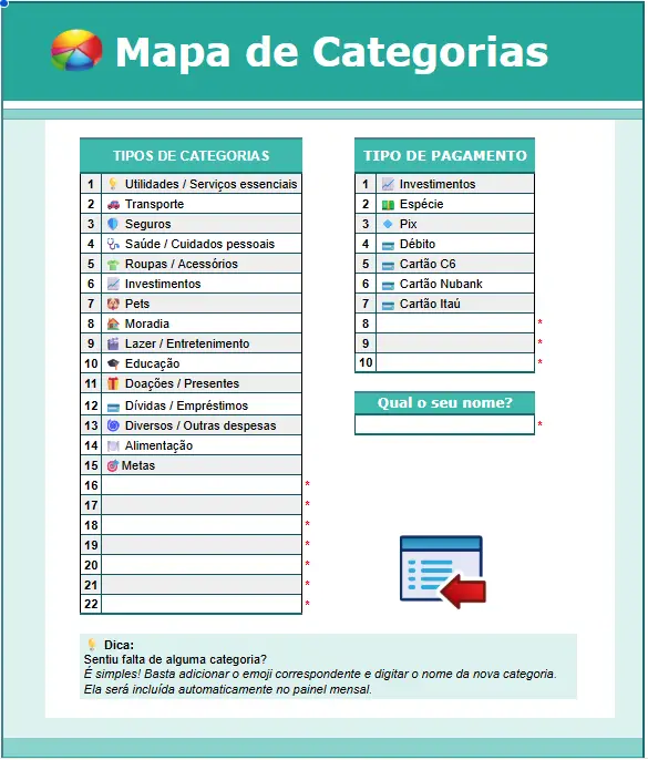 Organize seus gastos com praticidade e precisão usando uma base completa: são 15 categorias de despesas já prontas e 7 formas de pagamento disponíveis, além de campos extras que você pode adicionar conforme sua necessidade.