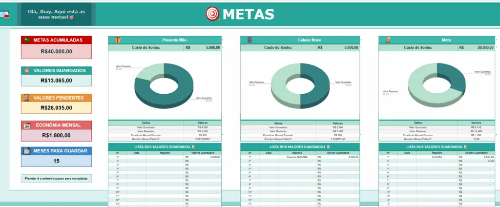 Crie metas como viagem, celular novo, reforma, moto e muito mais, definindo o custo total, o valor que pode guardar por mês e o tempo necessário para alcançar o objetivo.